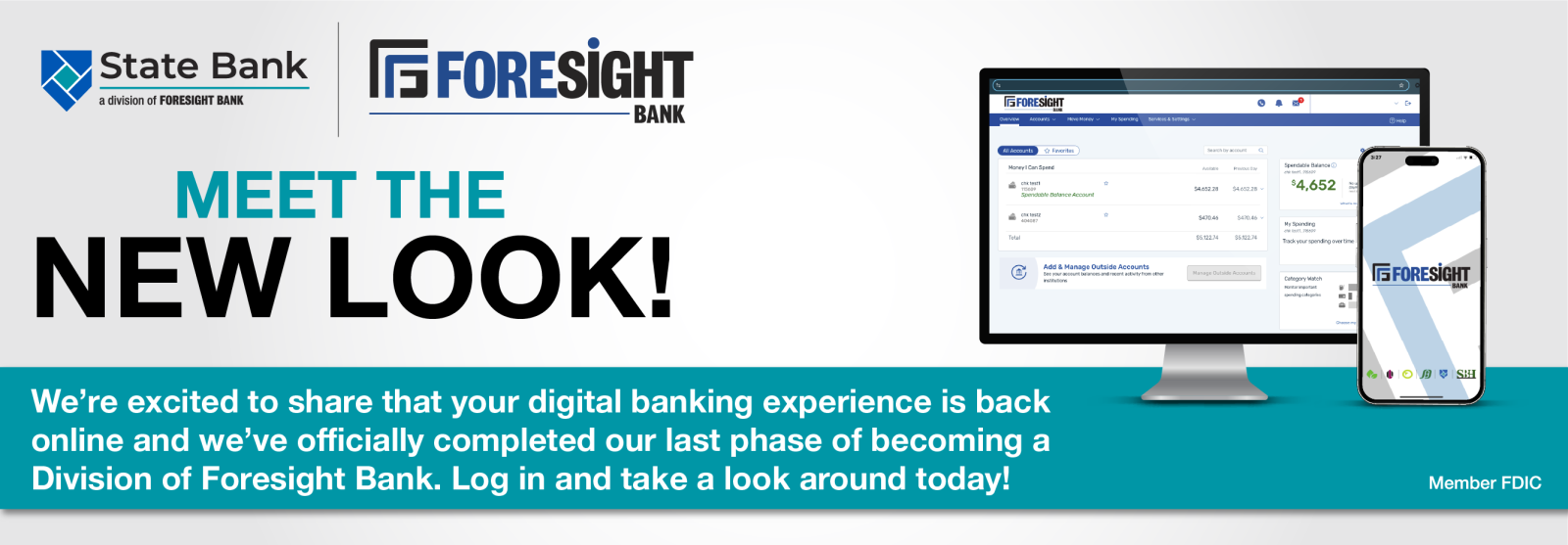 [MARCH 2025] At State Bank, we’re always looking for ways to better serve you. As part of the Foresight Financial Group family of banks, which includes German American State Bank, Lena State Bank, State Bank of Davis, Northwest Bank of Rockford, and State Bank of Herscher, we’re proud to offer the best of both worlds: the strength of a larger network combined with the local service and decision-making that you value. Over the past few years, we’ve worked as a group to enhance services and improve efficiency, always with you—and the well-being of our communities—in mind.